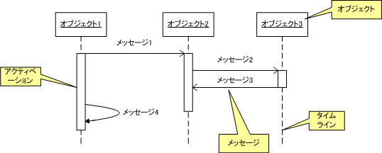 シーケンス図には、上部に「オブジェクト」を持つ「タイムライン」と呼ばれる縦線と、その上に縦長の長方形で表された「アクティベーション」、さらにアクティベーション間の「メッセージ」によって構成される。