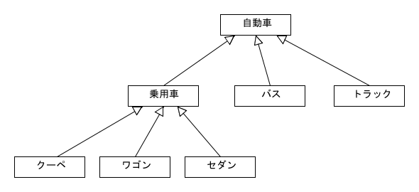 のような図を考えることができる。これも階層構造をあらわしているが、エンジンがガソリンエンジンとディーゼルエンジンの2つの部分から構成されているというわけではなく、エンジンにはガソリンエンジンとディーゼルエンジンの2種類があることを表す。言い換えれば、ガソリンエンジンとディーゼルエンジンは両方ともエンジンである、ということを意味する。