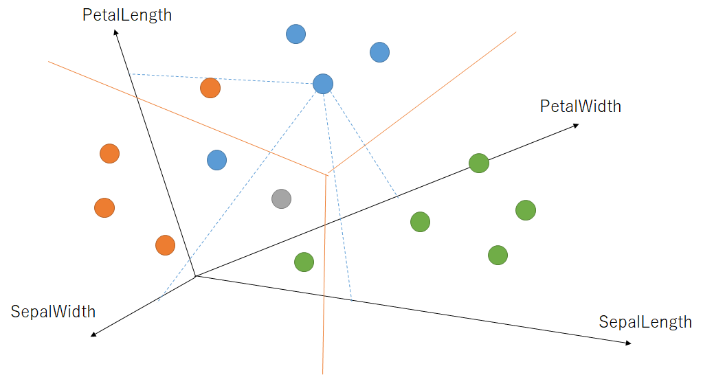 - KNeighborsClassifier: n=5なので近い5個で多数決をとっている。