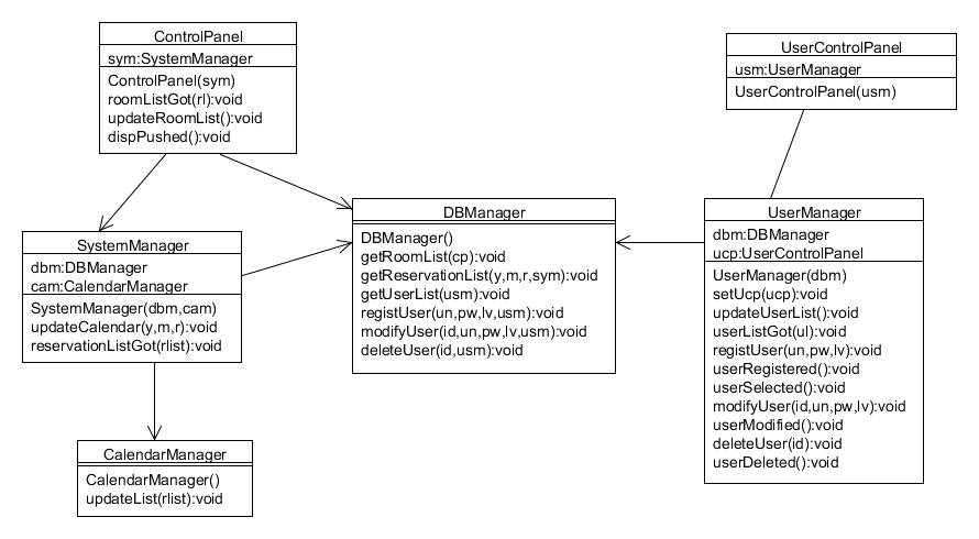 シーケンス図のオブジェクト間のメッセージやり取りの関係からクラスの関係を導くと以下のようになる。