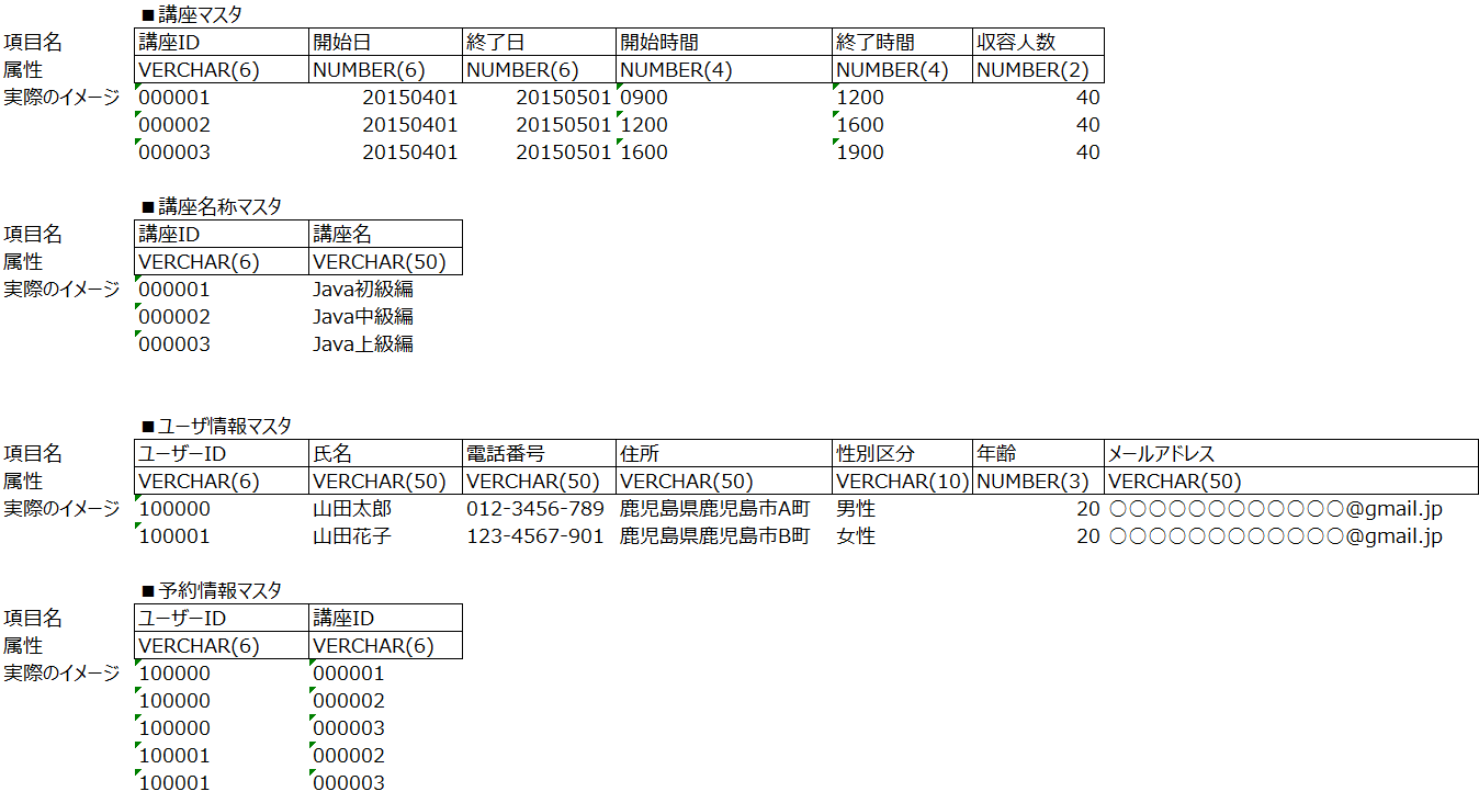 ■予約画面 ・ラベル(予約画面) ・ラベル(日付)※項目名 ・ラベル(講座)※項目名 ・ラベル(日付) ・ラベル(講座) ・ラベル(開始時刻~終了時刻) ・ラベル(あと何人) ・ラベル(あと何人) ・ラジオボタン(時間) ・ラベル(ID) ・ラベル(氏名) ・ラベル(電話番号) ・ラベル(住所) ・ラベル(性別) ・ラベル(年齢) ・ラベル(メールアドレス) ・テキストボックス(ID) ・テキストボックス(氏名) ・テキストボックス(電話番号) ・テキストボックス(住所) ・ラジオボタン(性別) ・テキストボックス(年齢) ・テキストボックス(メールアドレス) ・ボタン(反映) ・ボタン(予約)