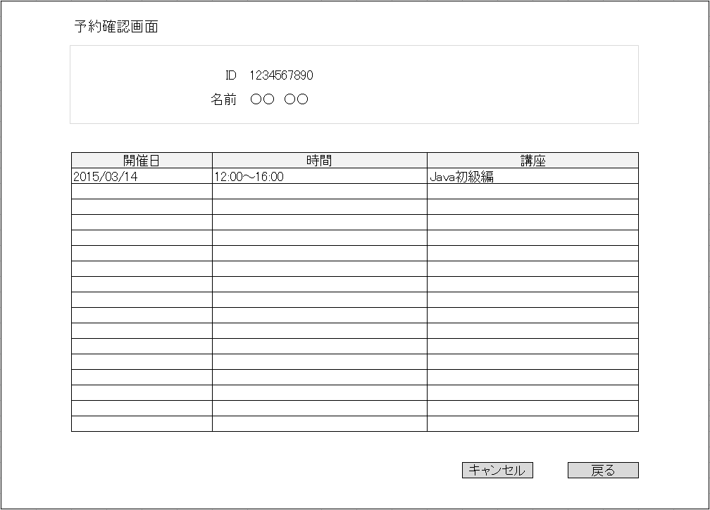 ■予約確認画面 ・ラベル(予約確認画面) ・ラベル(ID) ※項目名 ・ラベル(名前)※項目名 ・ラベル(ID) ・ラベル(名前) ・テーブル(セミナー) ・ボタン(キャンセル) ・ボタン(戻る)