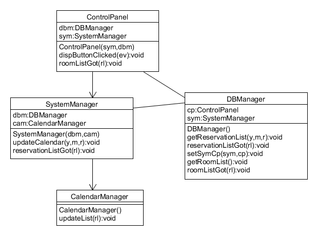 起動時の処理はページが読み込まれた時に開始される。 ここでの最初のオブジェクトは、このシステムそのものである。つまり、ページである。 ここでは各オブジェクトの生成処理が行われるが、その順序が重要である。 なぜなら、オブジェクトAがオブジェクトBを知っている必要がある場合、先にBを生成し、その後Bを与えてAを生成する方が楽だからである。 もしAとBが相互に知っていなければならないオブジェクトである場合は、Aを先に作り、Aを与えてBを作り、その後にAにBを教えてあげる必要がある。 今の場合、「予約を閲覧する」のシーケンス図から、制御パネルはシステム管理者を知っており、システム管理者はデータベース管理者とカレンダー管理者を知っている、という関係がわかり、このシーケンス図から制御パネルはデータベース管理者を知っていることがわかるので、生成順序が決定する。